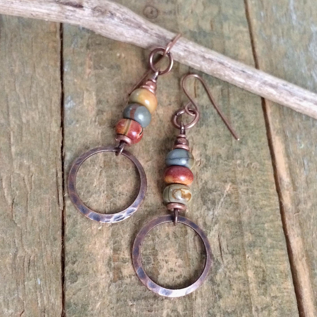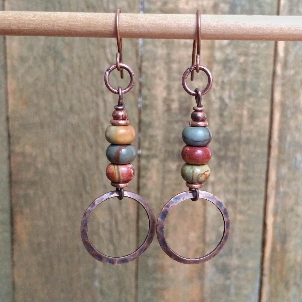Small red creek jasper and copper dangle earrings. Lightweight, earthy jasper stone earrings with a hammered copper ring accent.