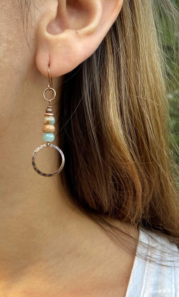 - Please note, the copper pieces of these earrings are antiqued (darkened) in batches, there may be slight variation in the lightness or darkness of the copper. Additionally there are variations in the coloration of the stones, each pair of earrings will vary slightly in color